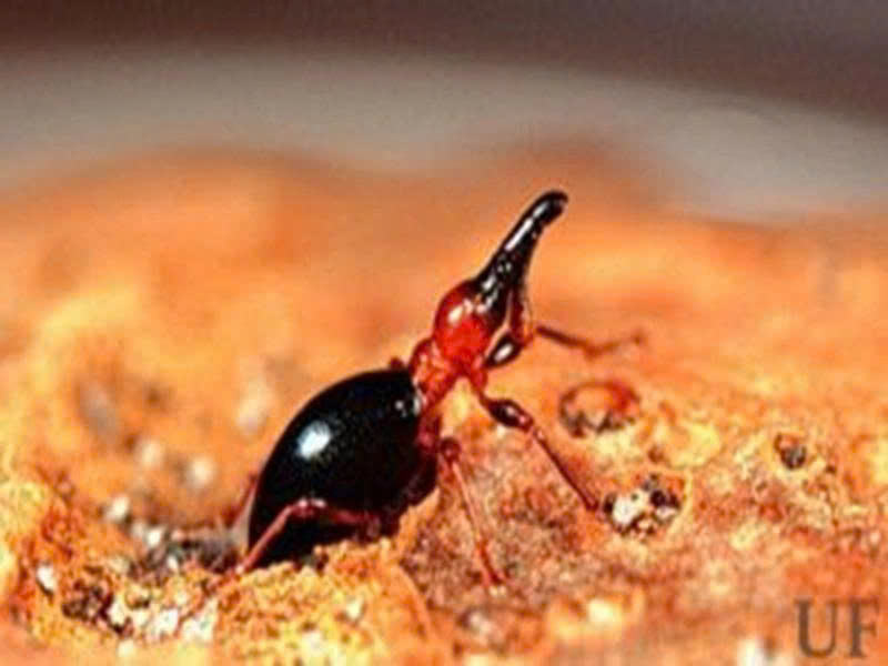 Thành trùng giống kiến lửa, dài khoảng 5,5 – 8,0 mm; đầu đen, râu/ngực/chân màu cam đến đỏ nâu; phần bụng có màu xanh ánh kim. Thành trùng thường gặm mặt dưới lá, giả chết nếu bị động, bay thấp từng đoạn ngắn và hoạt động mạnh về đêm.