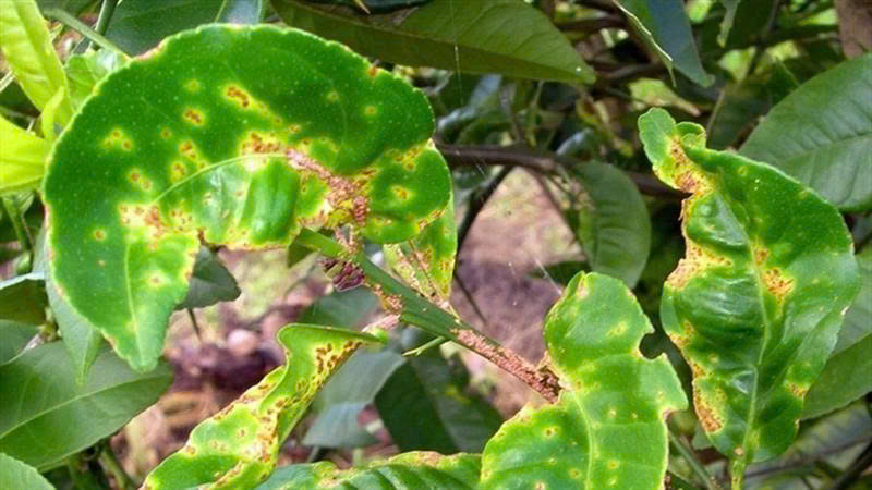Trên lá non, bà con có thể thấy các chấm nhỏ như mụn nước, sau đó thành vết sần. Với nhóm loét vi khuẩn, vết thường nổi gồ và có thể có quầng vàng; còn ghẻ do nấm hay làm bề mặt lá thô nhám và lá bị méo nhẹ. Lá bệnh nhiều sẽ giảm quang hợp và tạo nguồn lây sang trái/cành non.