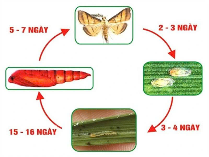 Theo tài liệu bạn cung cấp, sâu cuốn lá một năm có thể phát sinh 8 – 10 lứa. Trứng thường đẻ ở mặt dưới lá; sau khoảng 5 – 7 ngày trứng nở ra sâu non. Khi cây bị ăn hết lá ở khu vực đang gây hại, sâu non có thể nhả tơ và nhờ gió đu đưa để chuyển sang cây khác, tiếp tục gây hại. Sâu non già thường cuộn lá làm kén hóa nhộng; vũ hóa rồi lại đẻ trứng cho lứa kế tiếp.